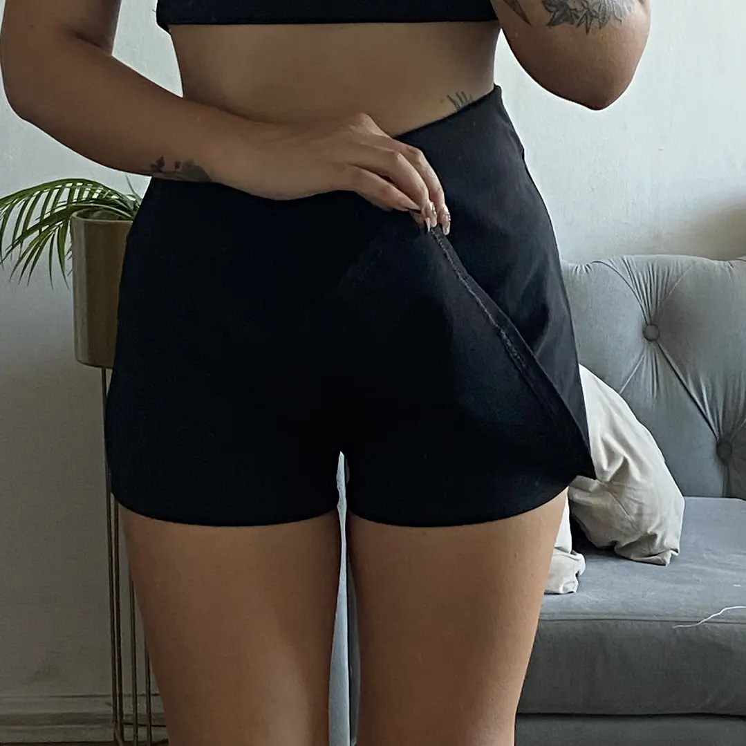 Falda short en tono negro básico de gabardina. Ideal desde talla 36 hasta 42 de pantalón. Tela elasticada.